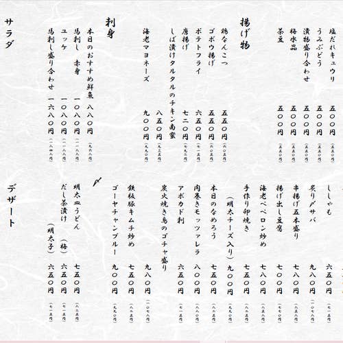 ディナー 17:00 〜 24:00 L.O. 23:00 売り切れ次第終了